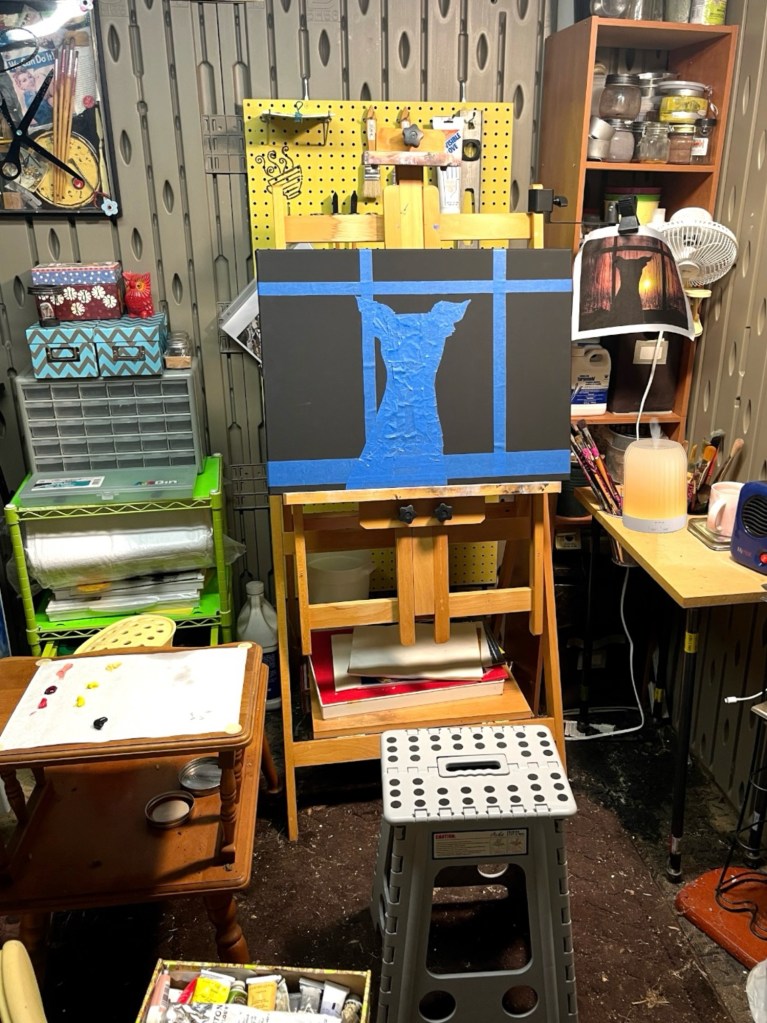 My mediums are oil paints and chalk pastels. Here’s my cozy little artist studio. It’s not much but it’s all mine. As long as it’s not called a “She Shed” I’m good.